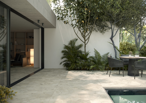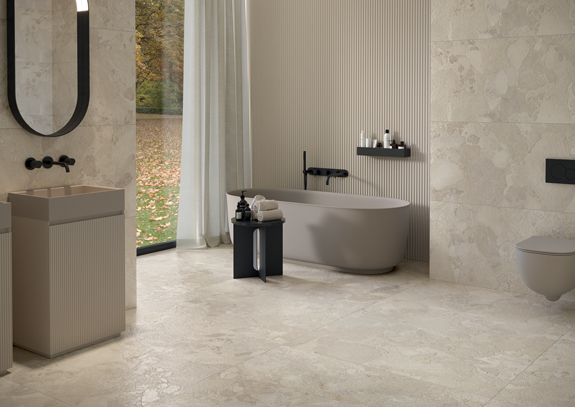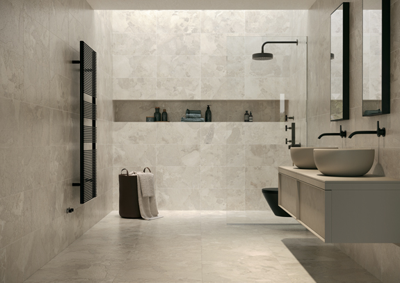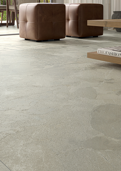 Imola interprète au mieux cette saveur de la pierre calcaire, à travers une surface lisse et opaque, mais en même temps ondulée, formée par des éléments (galets) superposés.