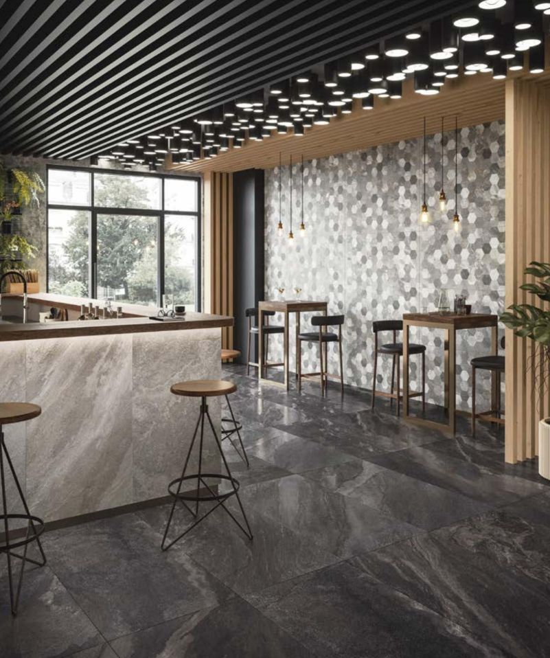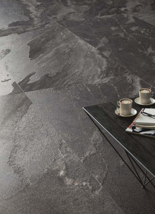 Le détail de la surface d’Evoluta présente des niveaux de tridimensionnalité et de variabilité d’épaisseur comparables à ceux de la pierre naturelle.