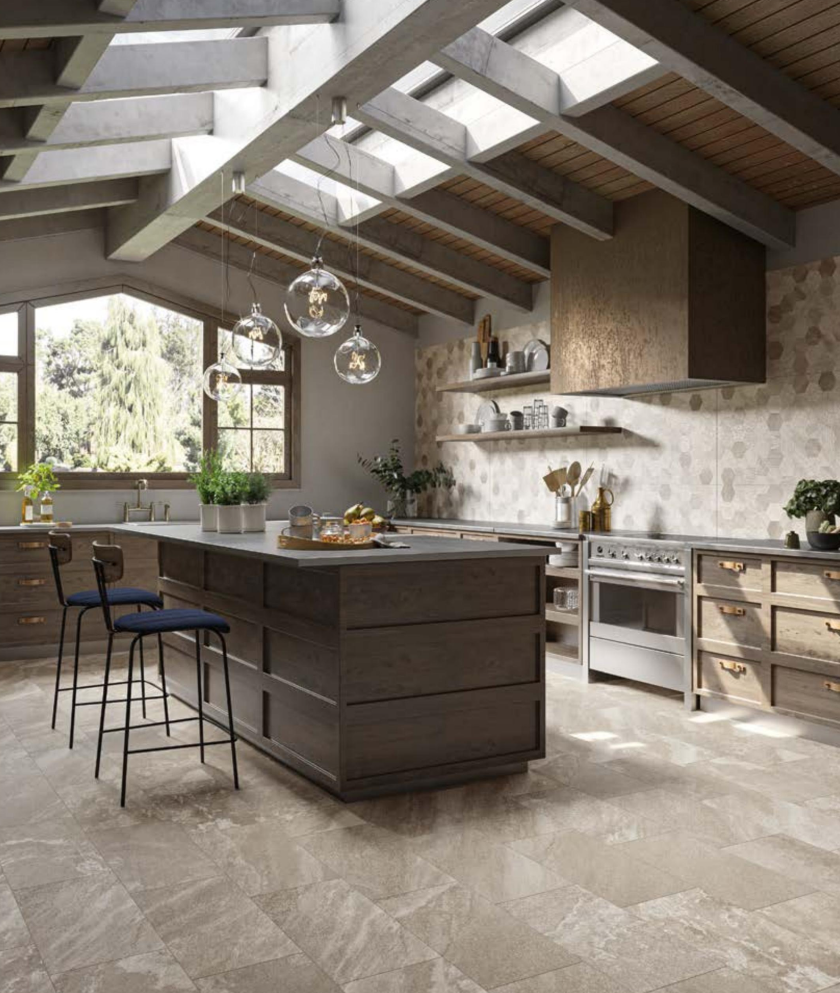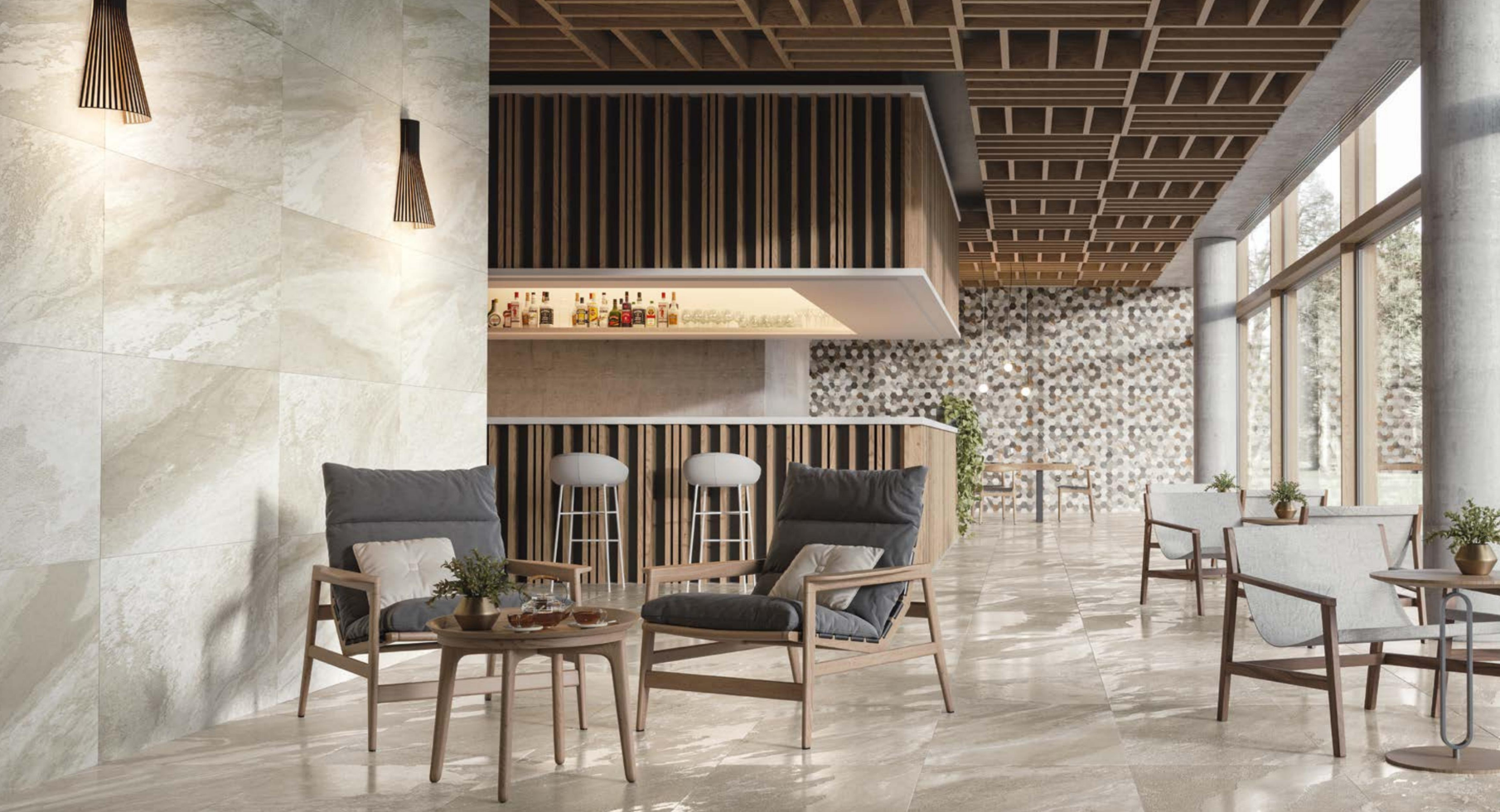Le détail de la surface d’Evoluta présente des niveaux de tridimensionnalité et de variabilité d’épaisseur comparables à ceux de la pierre naturelle.