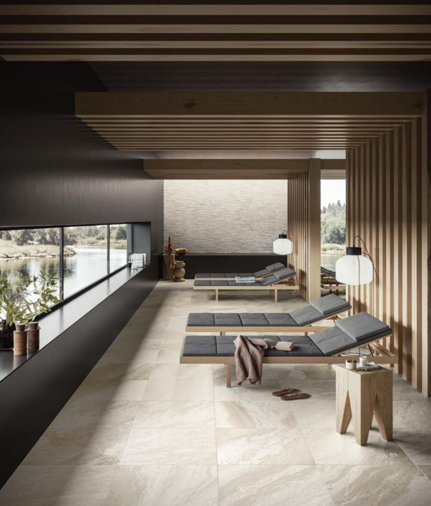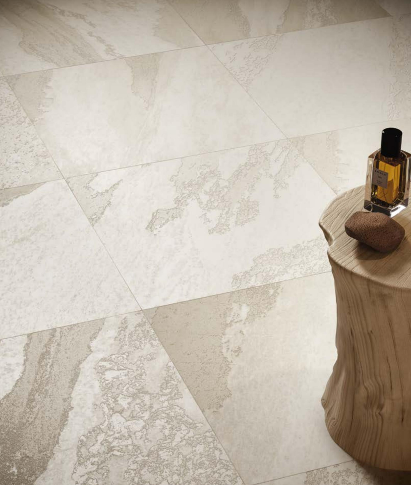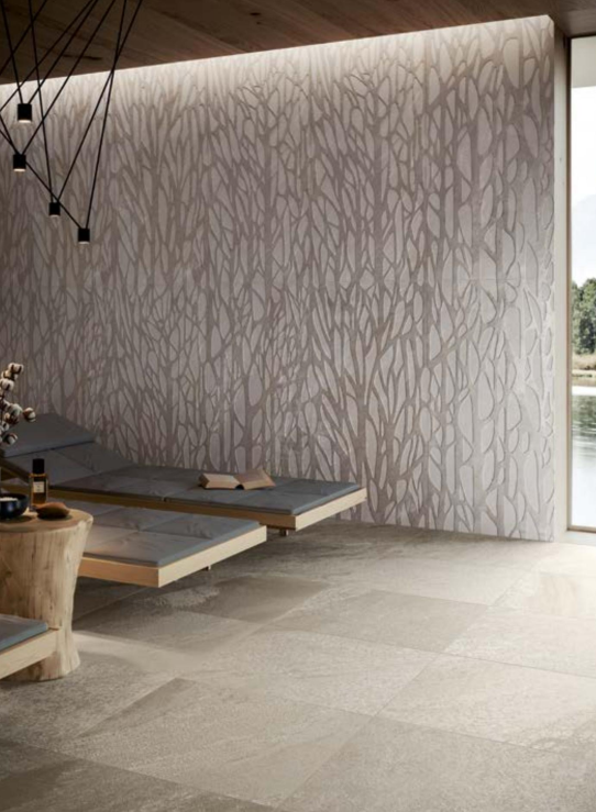 Le détail de la surface d’Evoluta présente des niveaux de tridimensionnalité et de variabilité d’épaisseur comparables à ceux de la pierre naturelle.