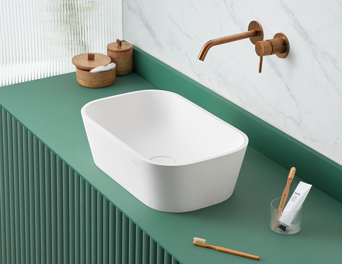 Vasque sanydur gel coat sur comptoir rectangulaire avec bonde click-clack blanc mat.